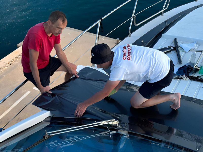 Realizacja obejmowała kompleksowe oklejenie łodzi motorowej Conam 600 Sport — zarówno całej części zewnętrznej, jak i wybranych elementów wnętrza. Zastosowana folia wylewana zapewniła eleganckie, trwałe wykończenie oraz odświeżyła wygląd jednostki. Dodatkowo wykonano i zamontowano podświetlane litery LED, które nadały łodzi nowoczesny i prestiżowy charakter.