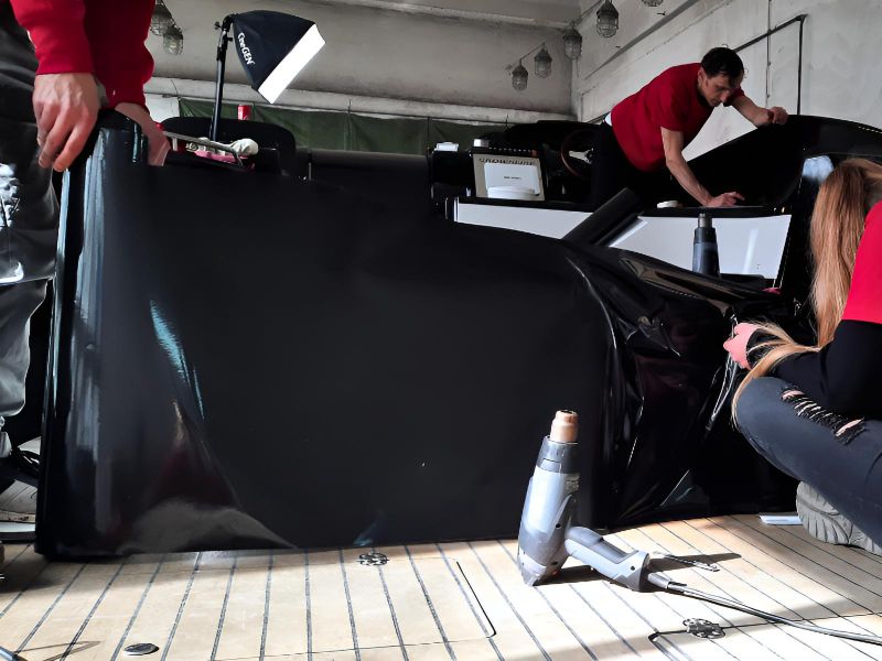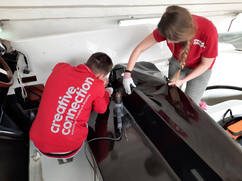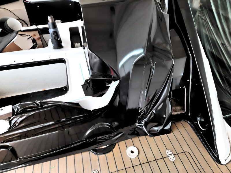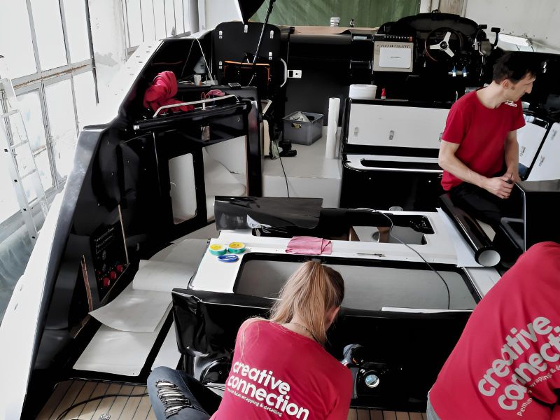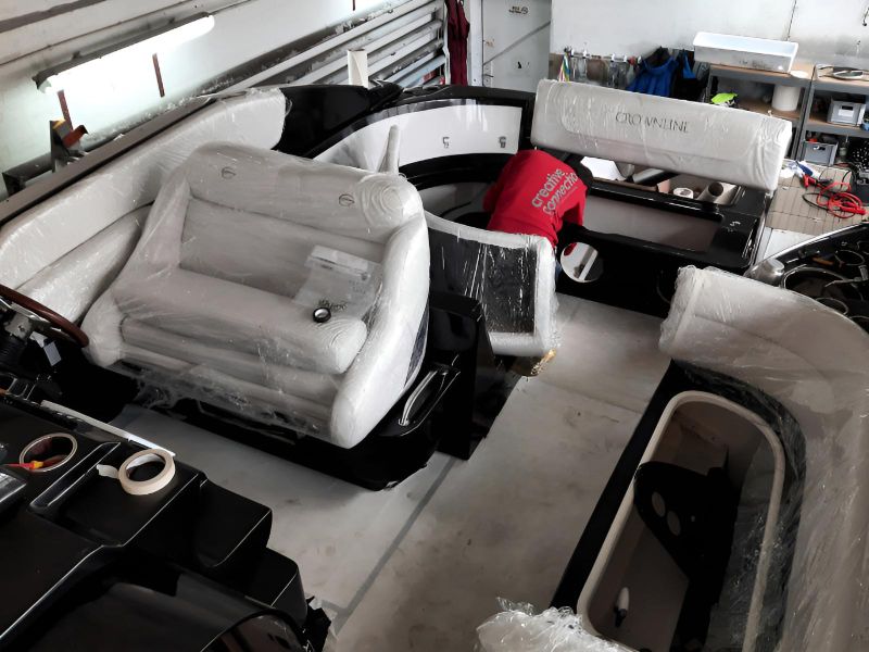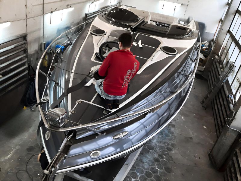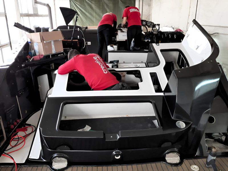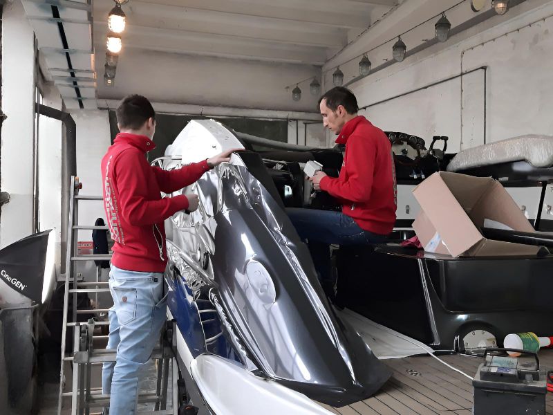 Realizacja obejmowała pełne oklejenie zewnętrznej części łodzi motorowej Crowline 320, a także kompleksowe oklejenie kokpitu. W miejscach, w których aplikacja folii była niemożliwa, powierzchnie zostały precyzyjnie pomalowane, aby zachować spójny efekt wizualny. Dzięki połączeniu obu technik jednostka zyskała świeży, nowoczesny wygląd i perfekcyjne wykończenie.